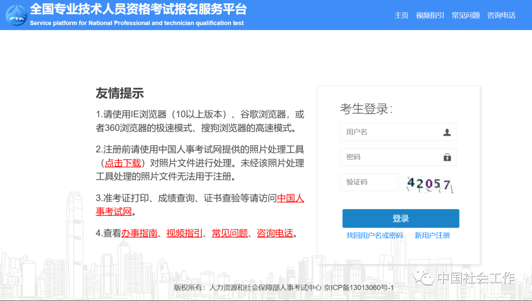 大家可以从“中国人事考试网”首页直接进入“网上报名”,也可以从各省人事考试网点击“网上报名”,选择“社工考试报名”,跳转到中国人事考试网报名。这里直接介绍在中国人事考试网如何报名。