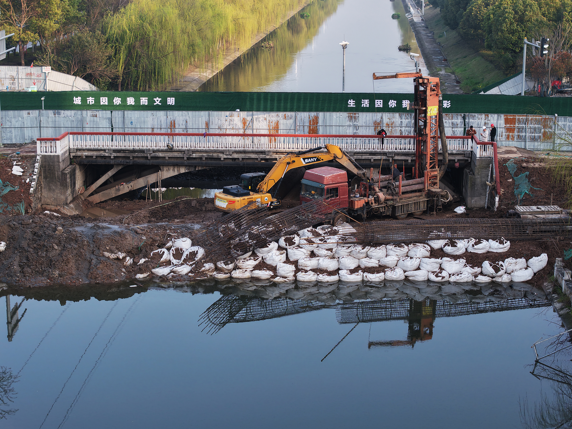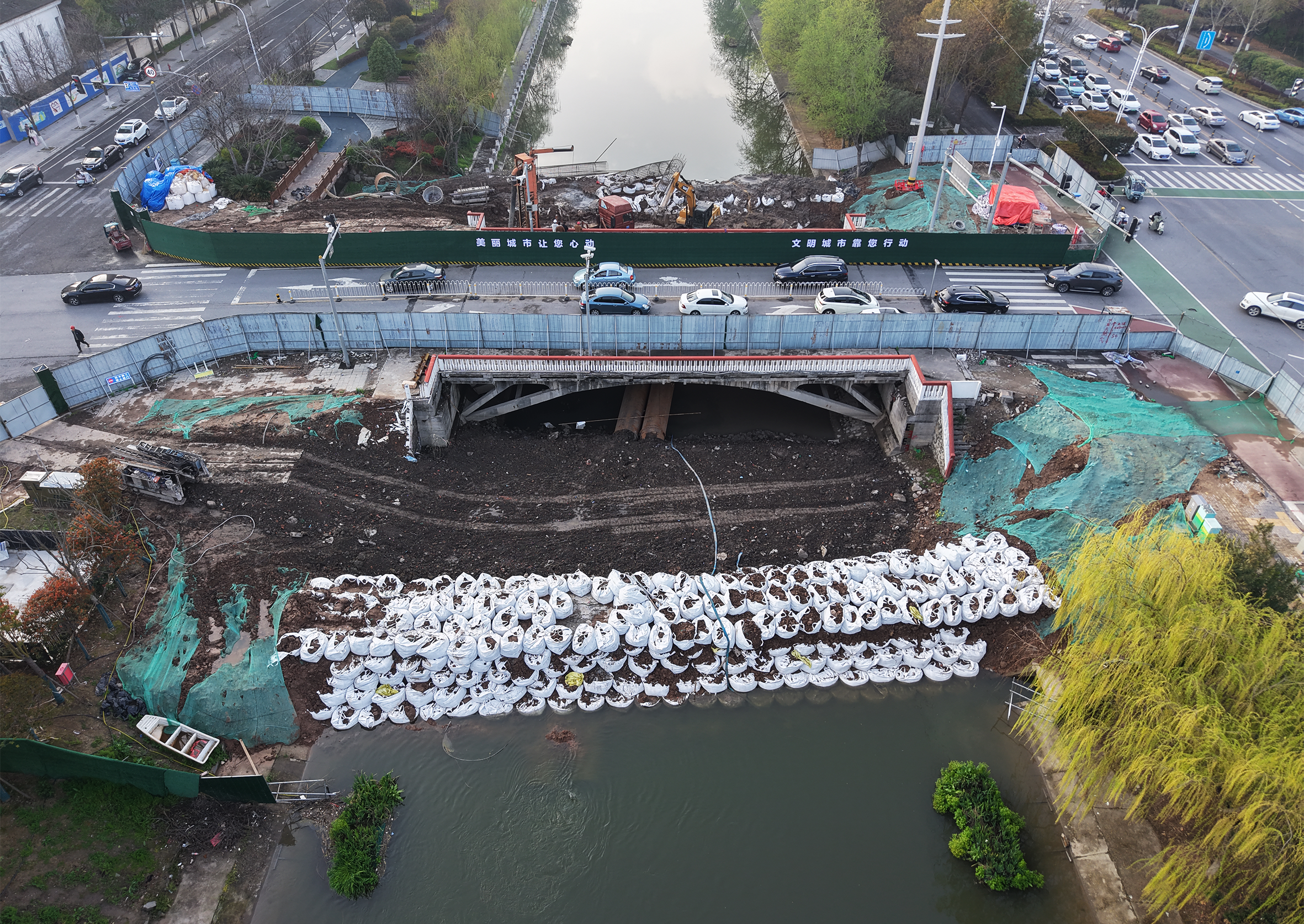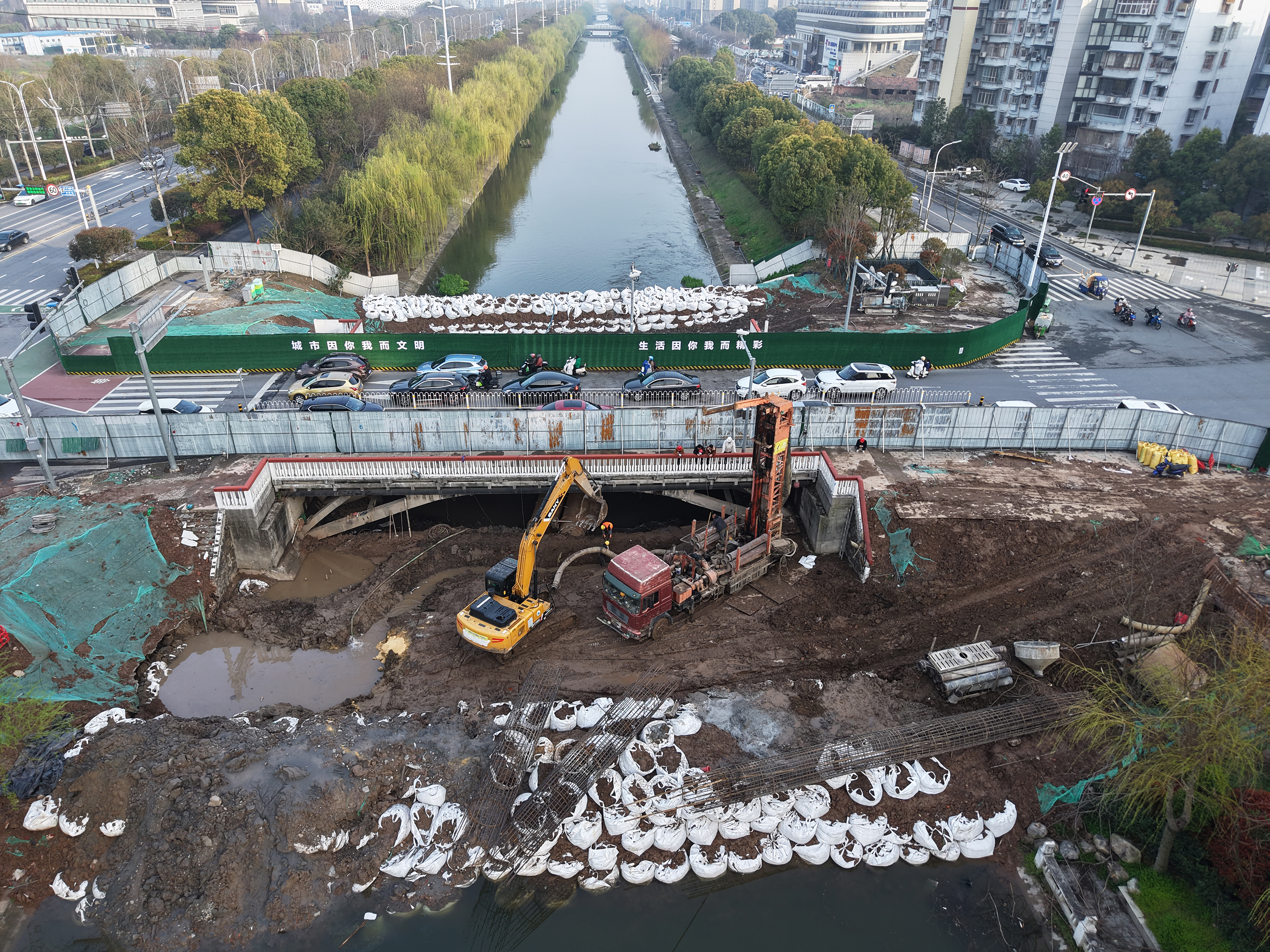 据施工人员介绍,自正月初八复工以来,沙市五中、工农路、绿地海外滩沿线由东向西近2000米范围内,三座桥梁同步施工。目前,桥上车辆通行秩序正常,桥下两头水位已完成拦截,保障水下作业顺利开展。