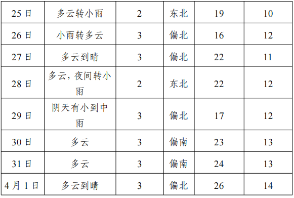 今天(3月23日)荆州市小雨、南部局地中雨,明天小雨转多云,后天 多云转小雨。今天到明天白天受弱冷空气影响,风力增大, 偏北阵风可达 5 到 6 级。 未来 4~10 天(3 月 26~4 月 1 日):26 日、28 日~29 日 白天全市有两次降水天气过程,其余时段大部以多云天气为 主。气温波动起伏,大部高温 16~26℃,低温 10~14℃。