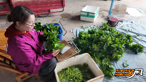 走进农场蔬菜大棚,一片绿意盎然、生机勃勃的景象映入眼帘。工人正娴熟地采摘着鲜嫩的苕尖,她们手法轻快,一根根翠绿、饱满的苕尖很快便装满菜筐。大棚外,农场主正在对刚采收的苕尖进行精心修剪和分拣,去除老梗黄叶,确保每一份苕尖的品质。随后,这些新鲜蔬菜将被迅速整理装箱。