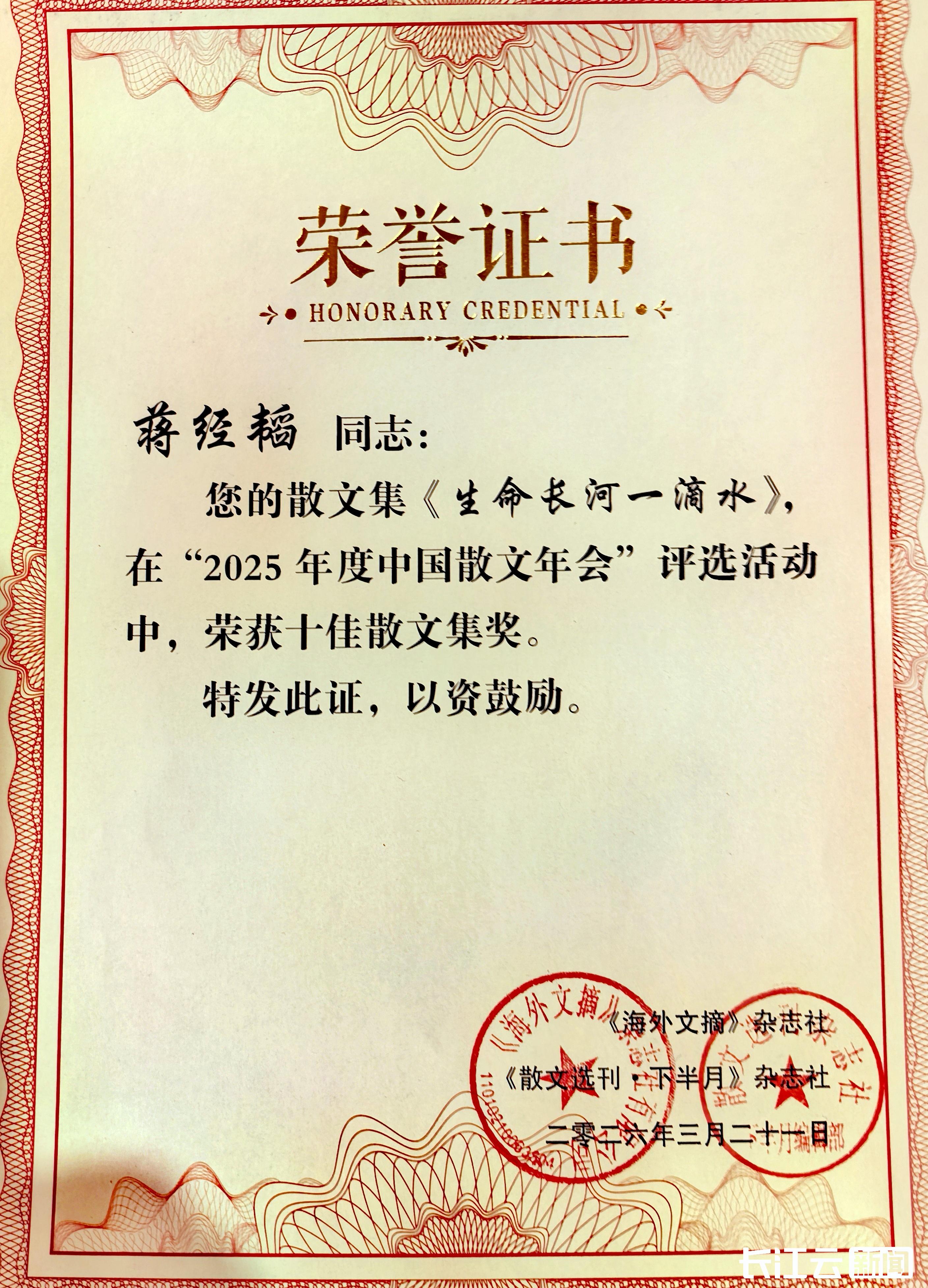 蒋经韬并非文坛新面孔。这位曾获湖北省政府出版奖、中国记协“从事新闻工作三十年”荣誉证书的资深媒体人,早在大学期间,就凭小说《校园酒吧》荣登《广西文学》头条,随后又以散文《金堤礼赞》荣登散文杂志头条,2025年6月刚刚斩获第二届国际冰心文学奖。彼时,评委会的颁奖词称其作品“将个体生命置于时光长河中,以谦卑姿态追问生命意义”,与诺贝尔文学奖得主古尔纳笔下的乡愁、马尔克斯对孤独的咏叹形成“跨越时空的共鸣”。如今再度获奖,足见其创作实力正被越来越多人看见。
