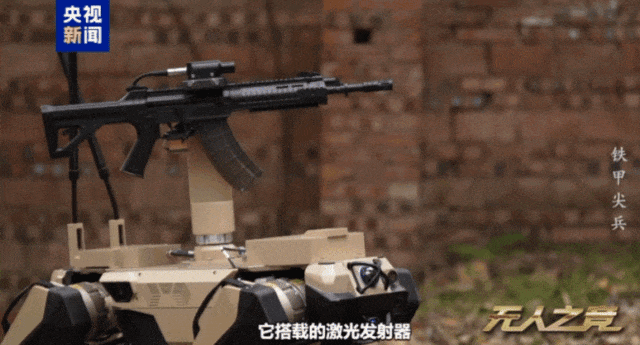 操作人员通过语音指令遥控“浴血”1号,背负4联装微型导弹率先模拟瞄准目标;