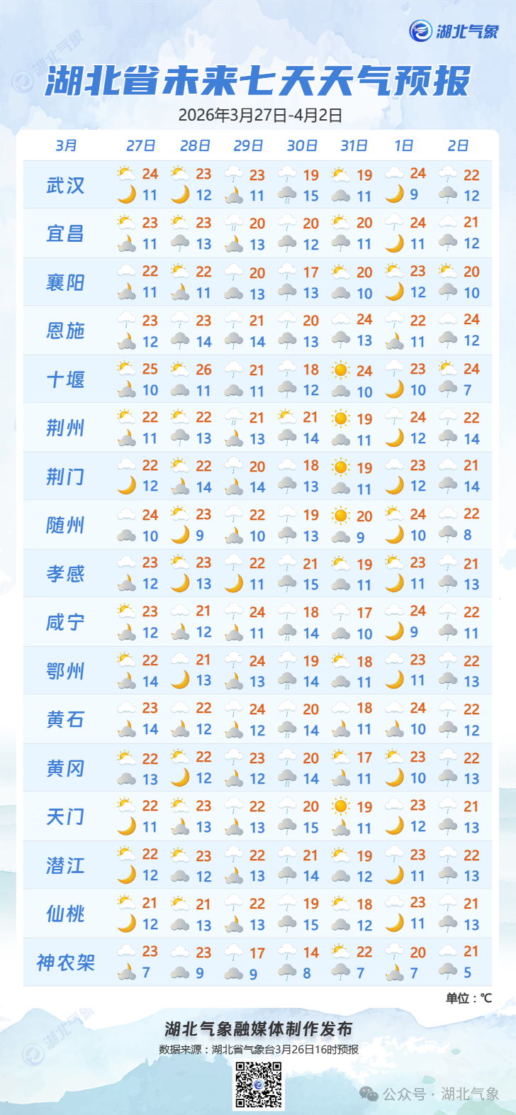 湖北最低5℃!暴雨、雷暴大风即将抵达 2026-03-27 08:29 长江云新闻 0 据中国天气网消息南方将迎今年首场大范围强对流天气今明两天南方多雨状态持续之后新一轮降雨又将无缝衔接 预计29日至31日四川盆地东部、江汉、江淮南部江南、华南北部及贵州东部等地部分地区有大到暴雨江南等地局地有大暴雨上述地区局地伴有雷暴大风或冰雹、短时强降水等强对流天气湖北天气 今天湖北大部地区 以多云到晴天为主 南部偶有小雨出没 后天(本周日)湖北大部又将转为降雨天气其中鄂东局地雨势较大同时北风增大今明两天最高气温 大部为20~26℃后天受弱冷空气和阴雨影响西部降至17~20℃东部则变幅不大根据天气预报图显示4月初湖北部分地区最低温降至10℃以下4月1日武汉、咸宁最低温9℃神农架7℃4月2日随州最低温8℃十堰最低7℃、神农架仅5℃