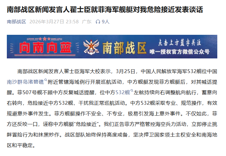 3月27日23时58分,南部战区微信公众号发布《南部战区新闻发言人翟士臣就菲海军舰艇对我危险接近发表谈话》,全文如下: