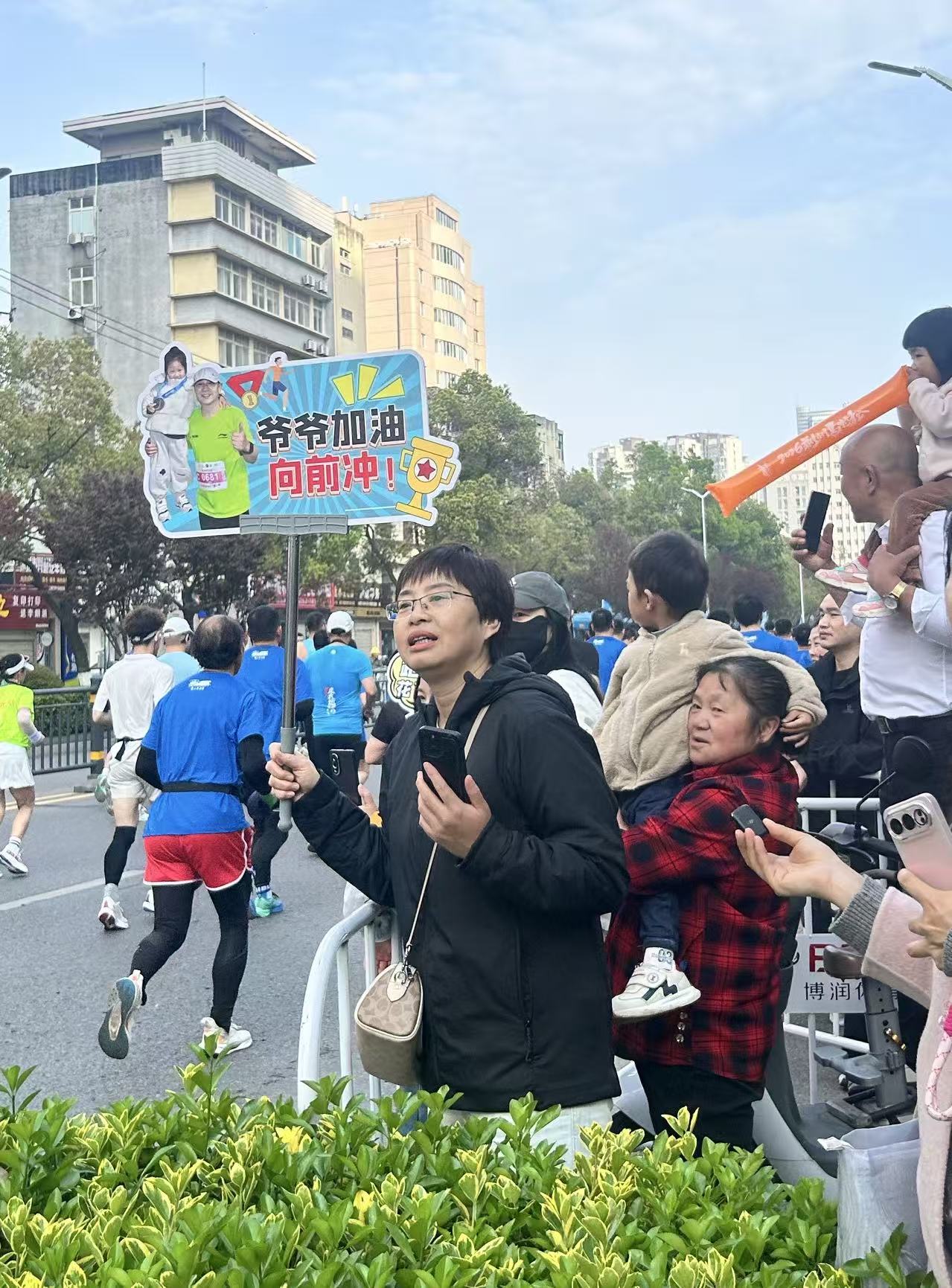 赛道两侧,不少市民手持加油牌,上面写着“荆马踏春向朝阳 不负楚城好春光”等鼓劲话语,为经过的选手们热烈加油。