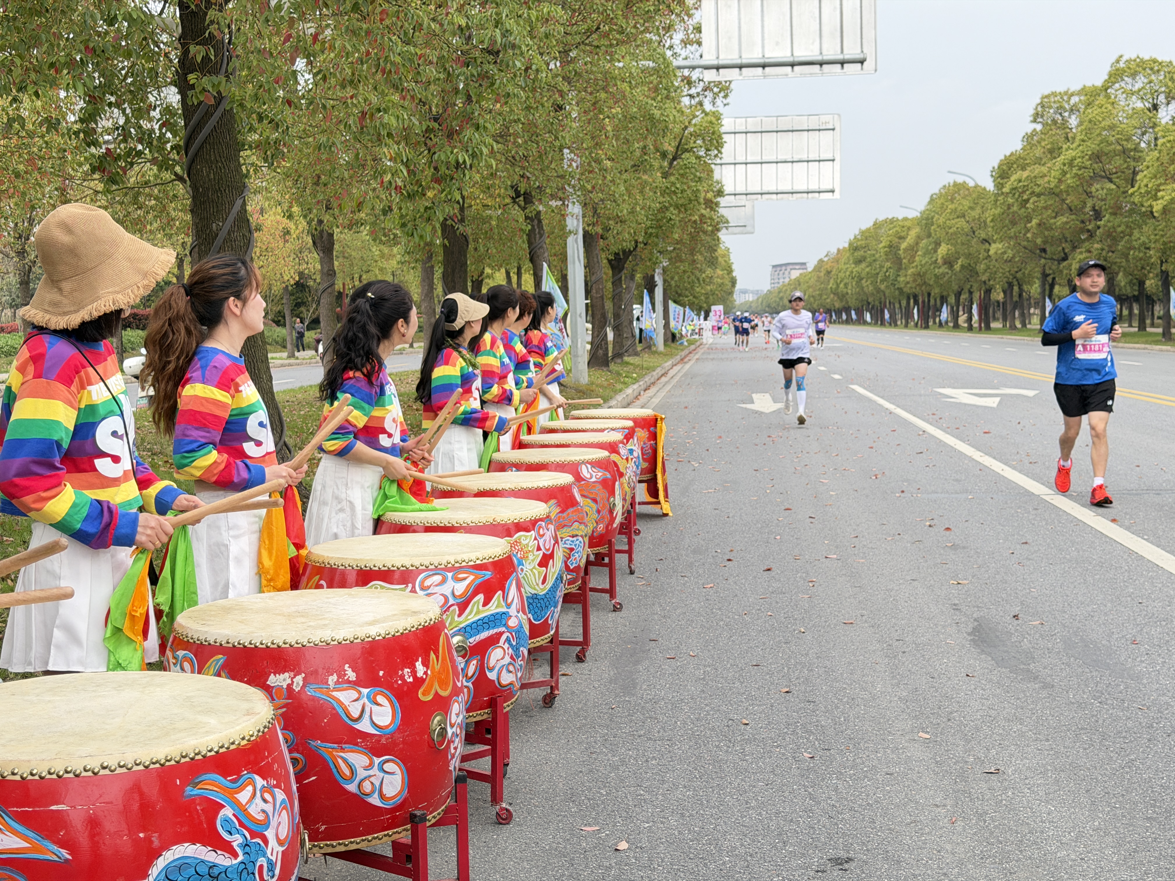 “咚咚咚”……凤凰大桥阙楼处,一支由20人组成的楚风大鼓队伍击打出铿锵节奏。演员们身着凤凰舞裙,手持鼓槌,左右交替,动作利落,队形变幻间尽显飒爽英姿。高阳大道上,设置了荆马音乐加油站,激昂的节奏、明快的旋律,驻唱乐队用歌声为赛道注入活力与温暖。健身操、舞蹈、立鼓表演,纪南文旅区在沿线组织的13个特色氛围点,成为赛道旁一道流动风景线。此外,来自长江艺术工程职业学院、荆州技师学院的2200名学生啦啦队,热情呐喊,用青春的笑脸和此起彼伏的加油声,为奔跑的选手注入源源不断的动力。
