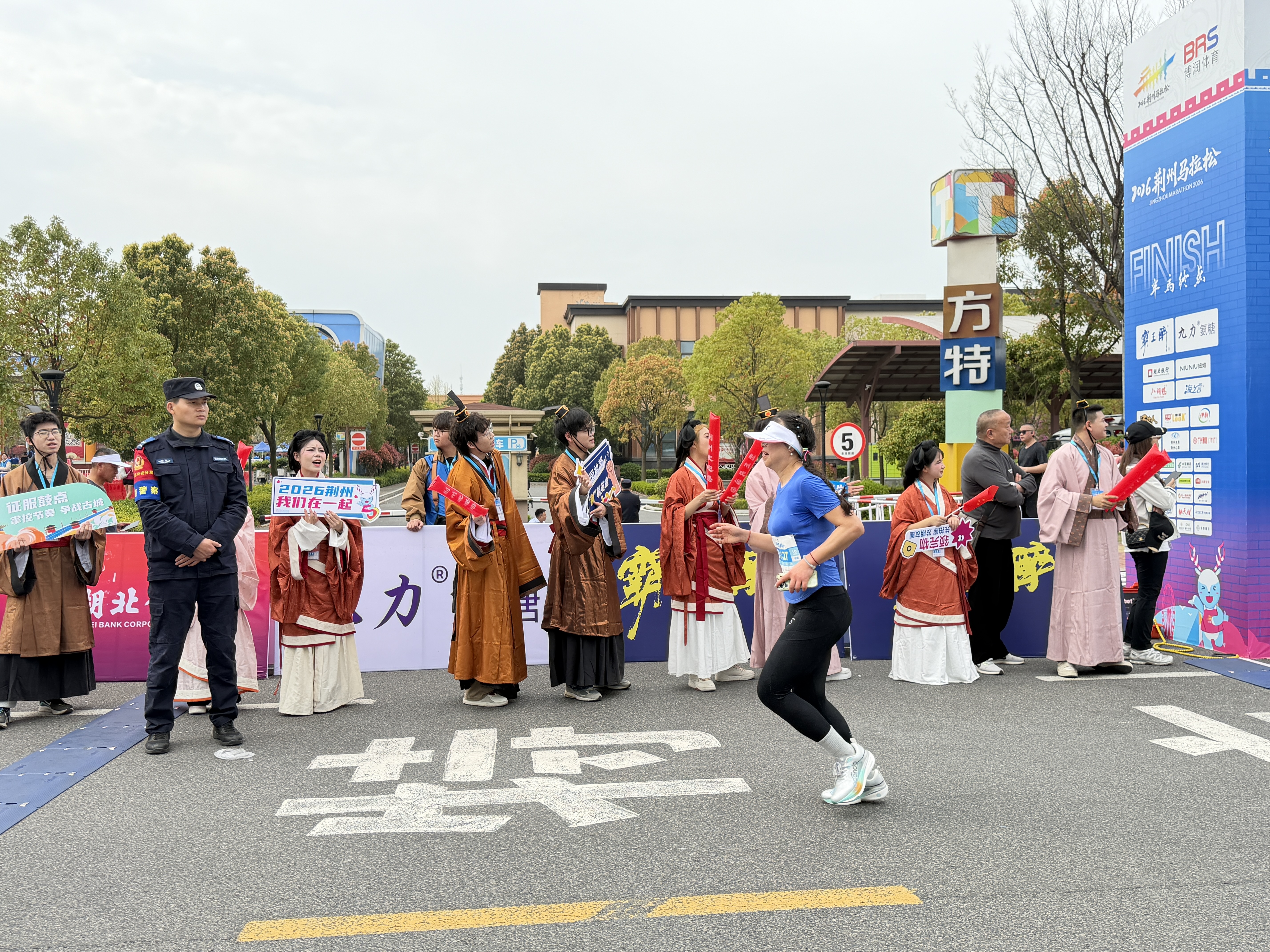 最热闹的还属位于荆州方特的半程马拉松终点处,NPC演员组成的楚服加油团,衣袂翩然,仪态雍容,一亮相便成为现场的“流量担当”。跑友们顾不上疲惫,纷纷上前合影留念。另一边,排骨藕汤、新桥草莓、海子湖青鱼、五一路米粉等独具荆州特色的“补给”,让大家在挥洒汗水之后,品尝古城最地道的烟火气。