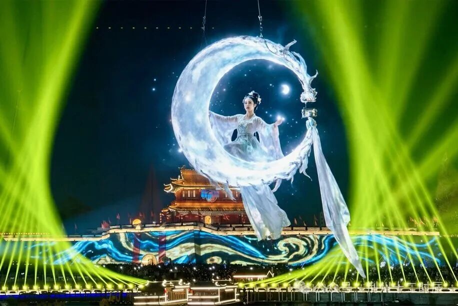 以宾阳楼背景,以护城河为舞台,御剑飞行、飞天撒花带你体验飞一般的感觉。还有超10米长的江豚气模河边遨游,绝对值得打卡!