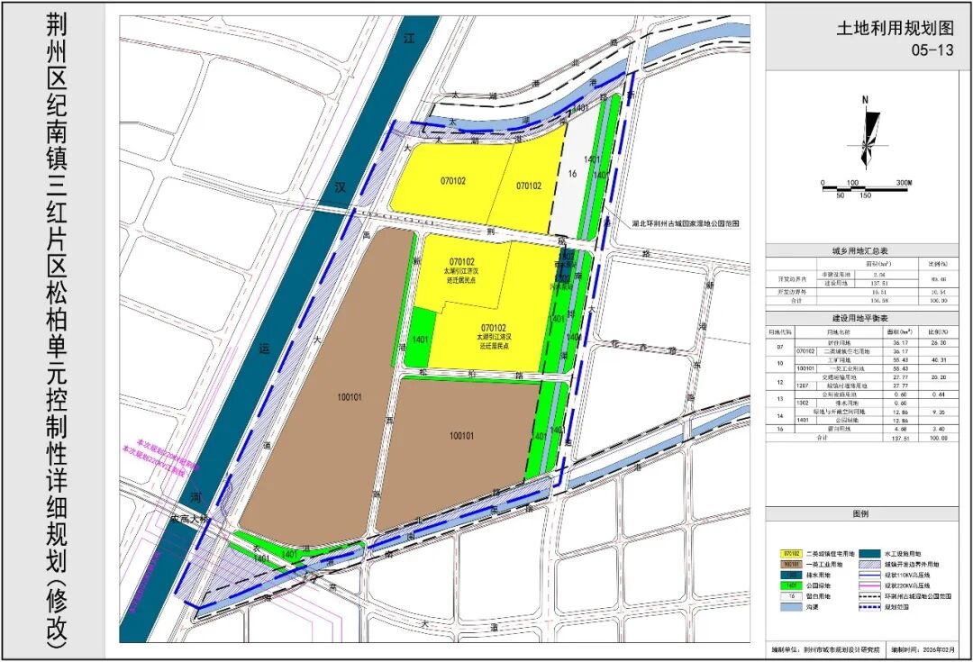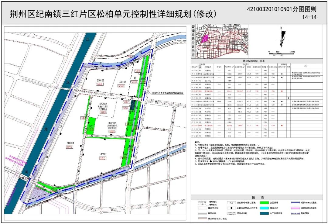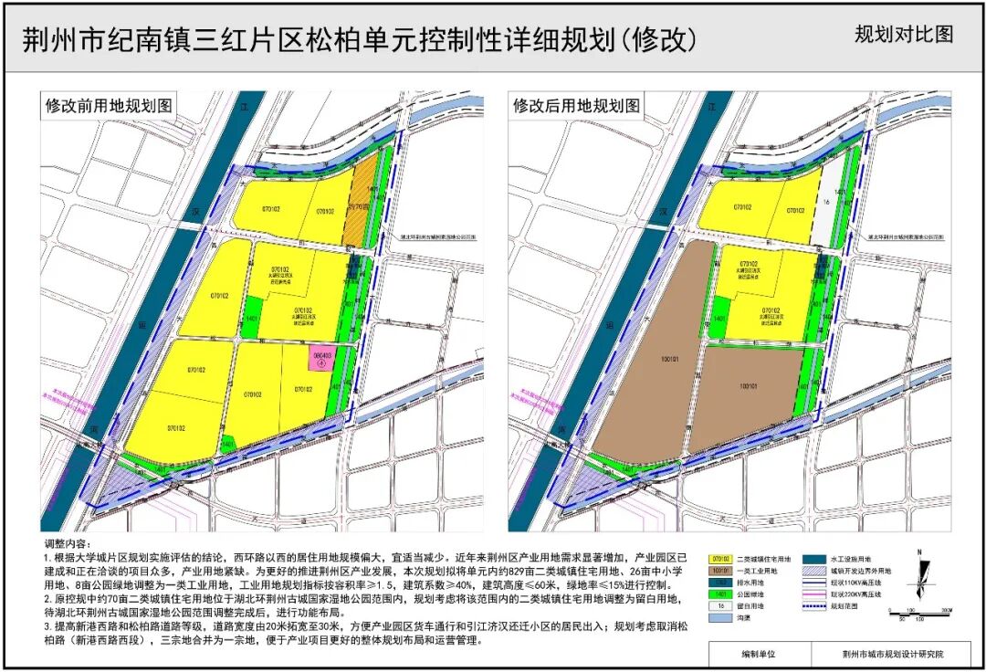 2.原控规中约70亩二类城镇住宅用地位于湖北环荆州古城国家湿地公园范围内,规划考虑将该范围内的二类城镇住宅用地调整为留白用地,待湖北环荆州古城国家湿地公园范围调整完成后,进行功能布局。