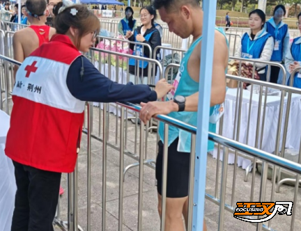 面对冲线后体力透支的跑者,志愿者们第一时间上前搀扶、递送饮水;人流高峰时段,他们定岗值守、耐心疏导。赛事进行至半程,一名选手冲线后突感体力不支、无法行走,值守志愿者迅速上前,毫不犹豫地俯身将其背起,快步送往医疗点,赢得现场跑者与观众的连连称赞。那一抹抹坚实的红十字背影,成为荆马赛道上最温暖的风景。