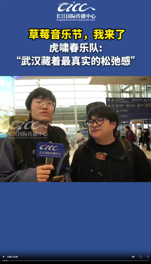 “节日感”的氛围不止弥漫在樱园。同一时间,草莓音乐节也在武汉炸场。虎啸春乐队的寒朝和涵宇一下飞机就感叹“好吃、舒服、接地气”。虽然他们来不及看樱花,但武汉的烟火气、绿草坪、穿城而过的火车,甚至湖里的“米级巨物”大鱼,都成了他们念念不忘的理由。