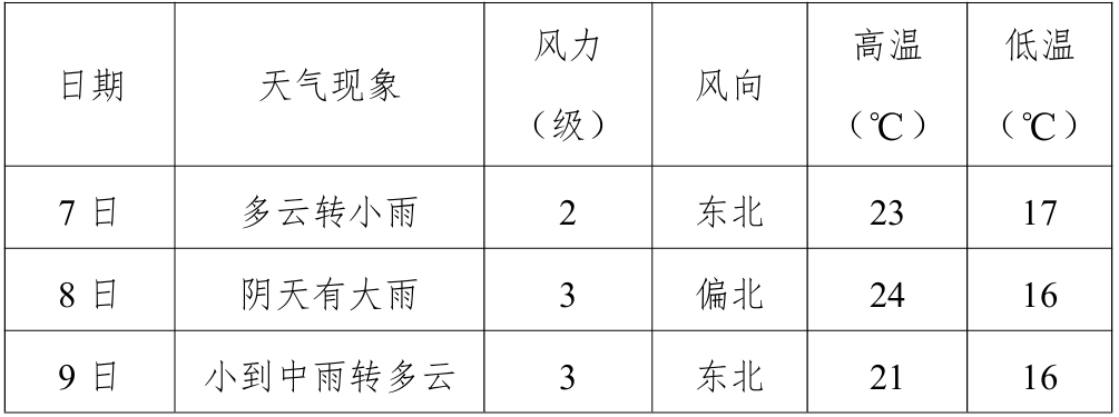 今天全市多云转小雨;明天到后天白天阴天有大雨到暴雨,并伴有强对流天气;后天夜间大部转为多云天气。