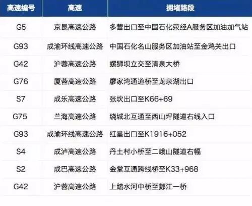 成渝地区易堵高速则是:京昆高速公路多营出口至中国石化荥经A服务区加油加气站路段等十个地方。