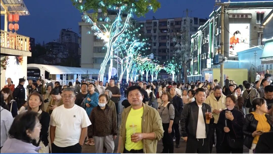 晚上七点,五一路上一处临街阳台化身剧场舞台,舞者随旋律翩然起舞,楼下人头攒动,掌声与欢呼声此起彼伏。每周五、周六及节假日夜晚,这条800米长的老街上,两处居民楼阳台小剧场联动30余家夜宵摊、手作坊,共同上演充满烟火气的光影秀与歌舞秀,吸引远近游客纷至沓来。
