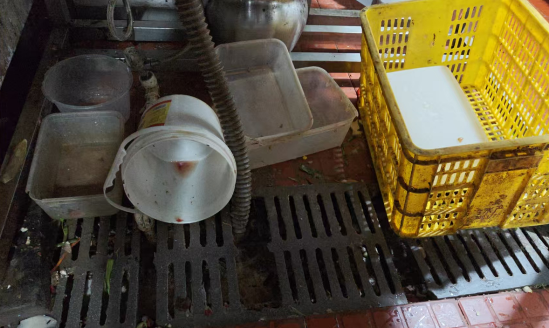 后厨环境卫生脏乱差,地面、墙面、天花板油污重,三防设施不规范、地漏多处破损、后厨大门未关闭,半成品储存不规范、冰柜内食品未加盖覆膜