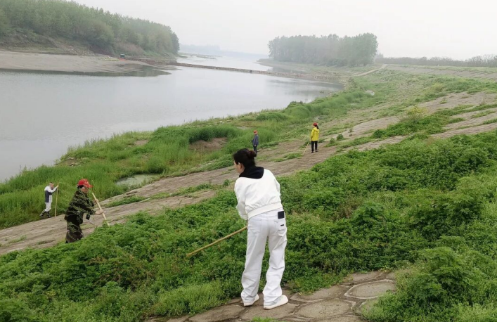 巡堤队伍沿着堤岸、林带、河滩等关键区域徒步巡查,重点检查堤防设施完好状况、植被稳固情况、河道水位变化及沿岸环境问题。志愿者们手持工具、分工协作,对硬化堤面杂草、林带枯枝败叶、河滩地形水位、坡地植被稳固性等逐一细致排查,不放过任何一处细节、不遗漏任何潜在隐患,以全域踏查守护堤防安全。