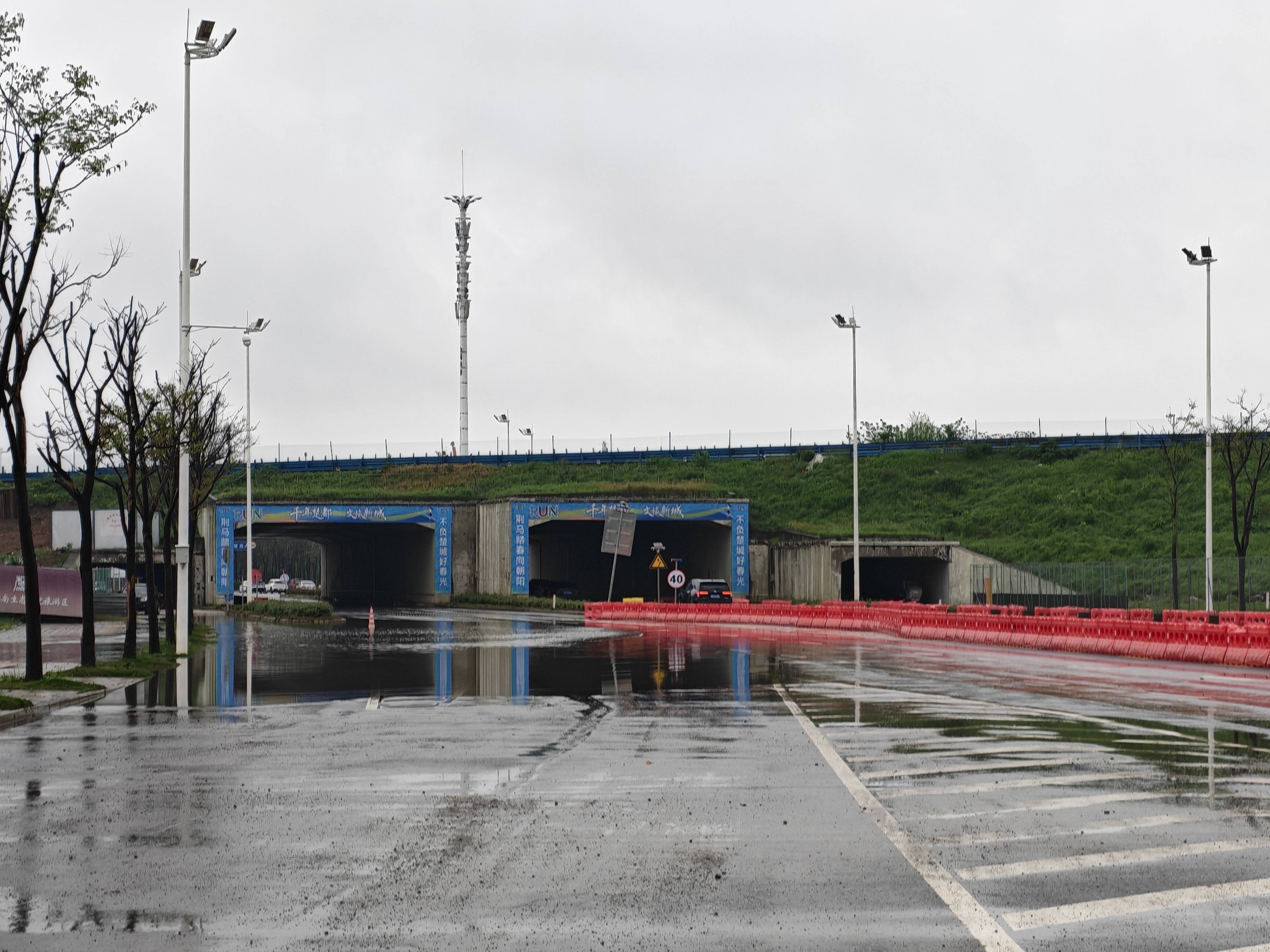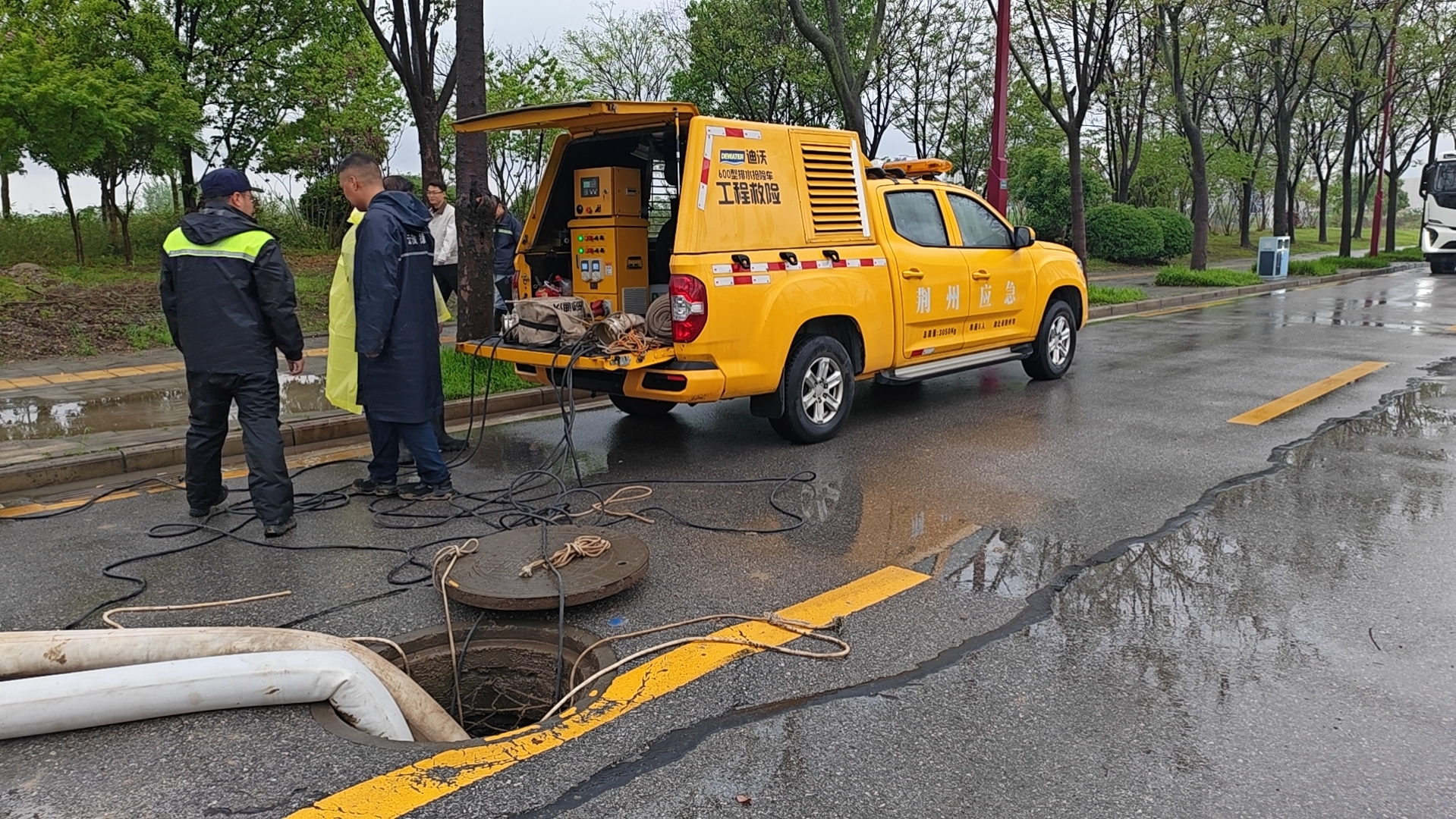 在武王大道与沪渝高速交会的涵洞处,受强降雨影响,路面形成大量积水,荆州市应急管理局工作人员正在紧急抽排积水。早上7点多钟工作人员和排涝设备全部就位,到上午10点,道路中间区域积水已明显消退,车辆可缓慢通行。