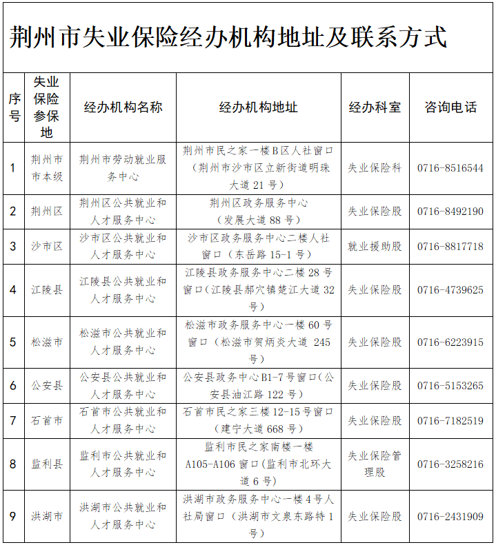 荆州市失业保险经办机构地址及联系方式