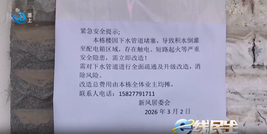 新风社区党委委员 曾华:我们也跟师傅了解了一下解决方案,大概就是从二楼开挖打一个洞,从那把管道引出来以后,通过外墙再重新走一个管道到下面排水口。我们已经准备在草拟一个告知书,然后通知居民,大概预算要五千块钱左右。也跟居民解释了,这属于公用部分,应该是由大家来分摊这个费用。