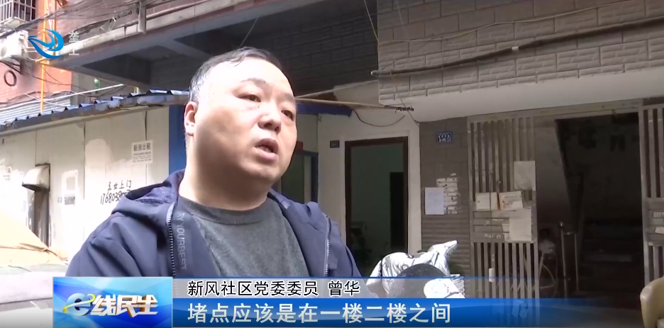 新风社区党委委员 曾华:当时我们就想,会不会是一楼的主管道,公共管道和路上的主管道堵了。我们请了专业的师傅,用了探测设备,从路面上探测,一直往楼里边探测,当时找的堵点应该是在一楼二楼之间,因为它是摄像头探测,到那个地方就上不去了,初步判断是这个问题。