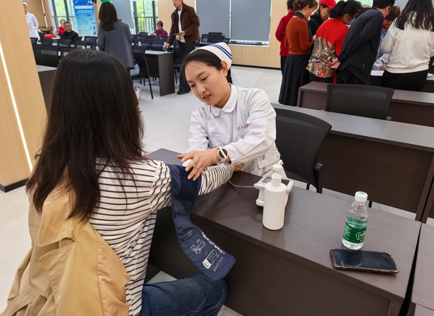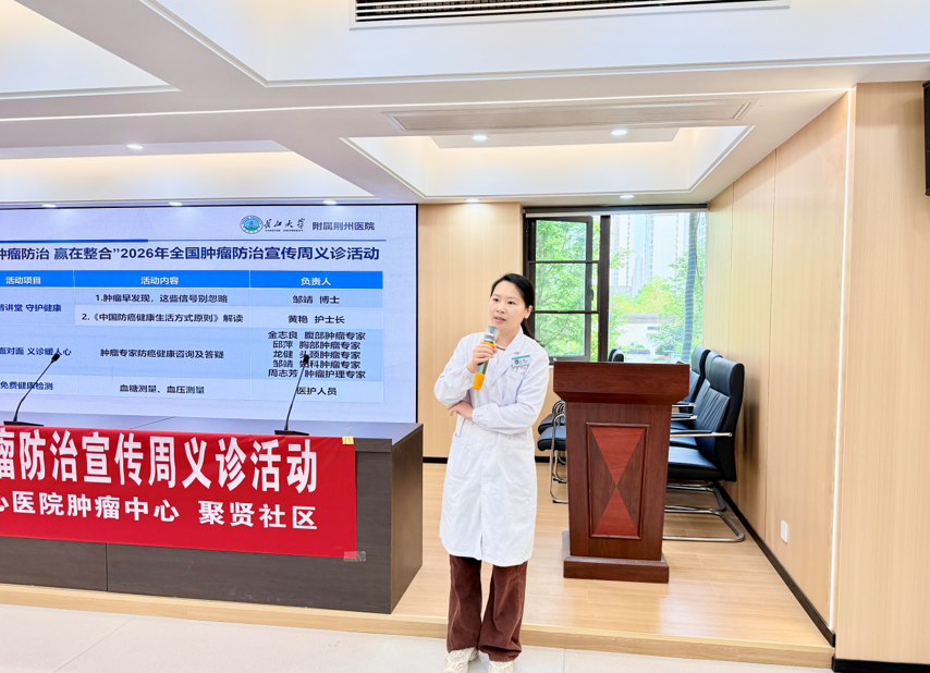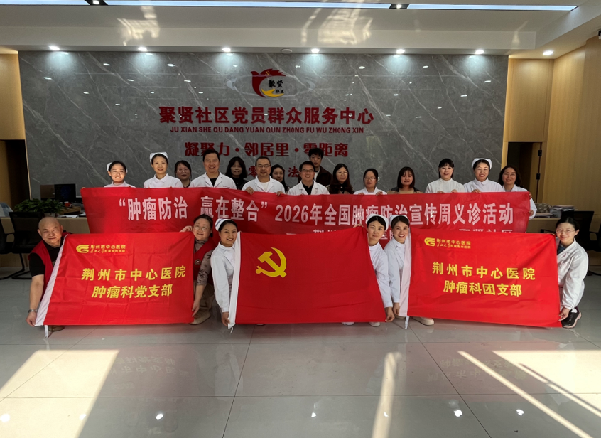 由荆州市中心医院肿瘤中心牵头负责人、知名肿瘤专家唐曦教授,肿瘤中心党支部书记金志良教授,带领科室医护团队组成的“豪华阵容”,来到荆州区郢城镇聚贤社区党员群众服务中心二楼会议室,为早就等候已久的社区居民开展了一场义诊活动,拉开了2026年全国肿瘤防治宣传周活动帷幕。