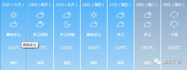 具体预报:今天白天,晴天多云,气温-1℃-13℃,偏东风2到3级;今天晚上到明天,晴天到多云,气温2℃-10℃,偏东风2到3级;明晚到后天白天,多云,气温3℃-12℃,偏东风2到3级。