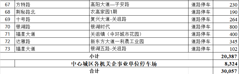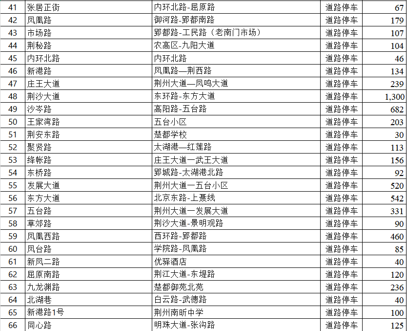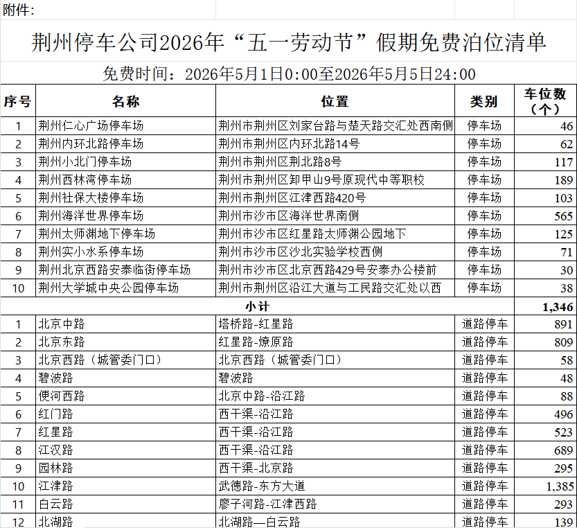 其中,荆州市中心城区免费泊位超过3万个。4月30日晚7时至5月6日上午7时30分,城区机关(事业)单位院内8324个泊位常态化免费开放,并统一悬挂免费停车标识;荆州城市停车投资运营有限公司免费开放10个公共停车场(1346个泊位)及道路公共停车泊位20387个。