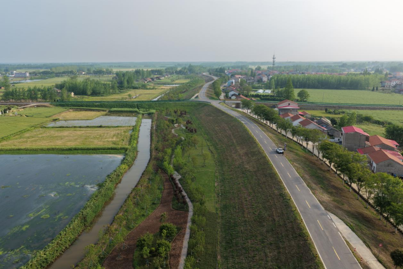 从高空俯瞰,滨湖大道堤岸旁,成片中山杉整齐林立、绿意葱茏,与各类特色苗木相映成趣,生态林带沿长江故道蜿蜒延伸,化作一条灵动的绿色长廊。四大景观节点错落分布,视线通透直达湖畔,碧水、绿树、江堤、民居相融共生,勾勒出“路在林中、车在景中、人在画中”的诗意江景。
