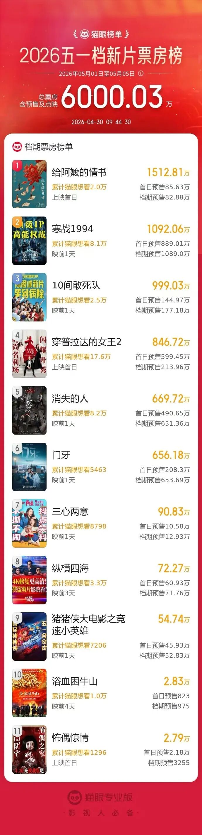 五一档新片预售票房破6000万 2026-04-30 16:43 猫眼专业版数据 0 据猫眼专业版数据,2026年五一档新片预售总票房破6000万,《给阿嬷的情书》《寒战1994》《10间敢死队》暂列五一档新片票房榜前三位。