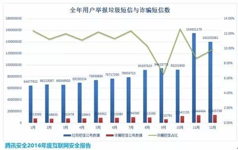 另据日前发布的《2016年度互联网安全报告》显示,某公司提供的手机管家用户全年共举报垃圾短信10.7亿次,经济越发达的地区,垃圾短信的数量多,且呈现逐月递增的趋势,因双11、双12的全民网购节、春节商家营销力度加大,垃圾短信在11、12月出现高峰期。