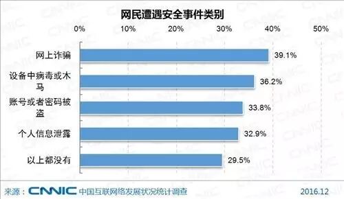 报告还显示,2016年遭遇过网络安全事件的用户占比达到整体网民的70.5%。其中网上诈骗是网民遇到的首要网络安全问题,39.1%的网民曾遇到过这类网络安全事件。