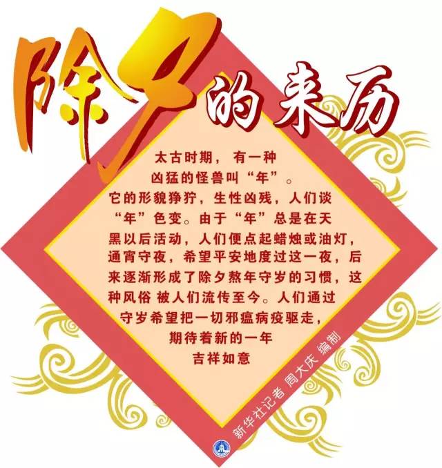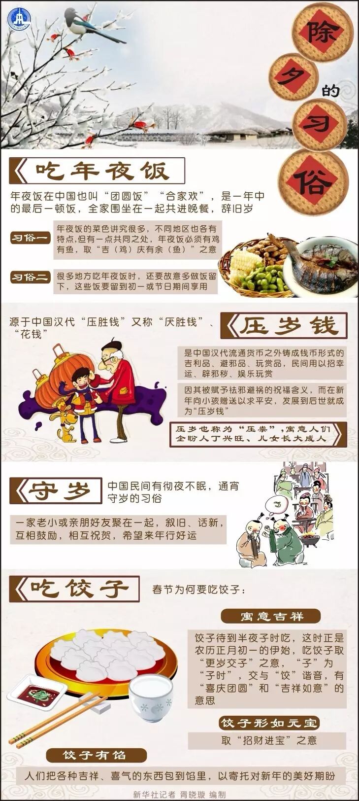 民俗专家、天津市专栏作家由国庆介绍说,除夕夜的团圆饭也叫年夜饭,根据宗懔《荆楚岁时记》的记载,至少在南北朝时已有吃年夜饭的习俗。传统上,年夜饭的美味佳肴中常包括水饺、鱼、年糕、长年菜等。远在他乡的游子,除非万不得已,再远再忙也要赶回家团圆,吃年夜饭。