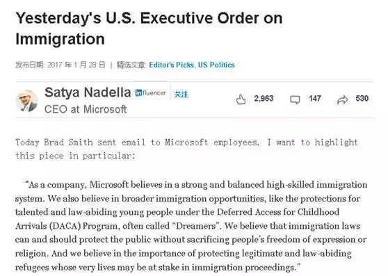 虽然特朗普此番禁令只针对7个国家,但微软公司高管也通过内部邮件告诉员工:“无论来自哪个国家,移民对整个微软都至关重要。”微软的印度裔CEO萨提亚•纳德拉在社交媒体上转发了这封内部邮件。