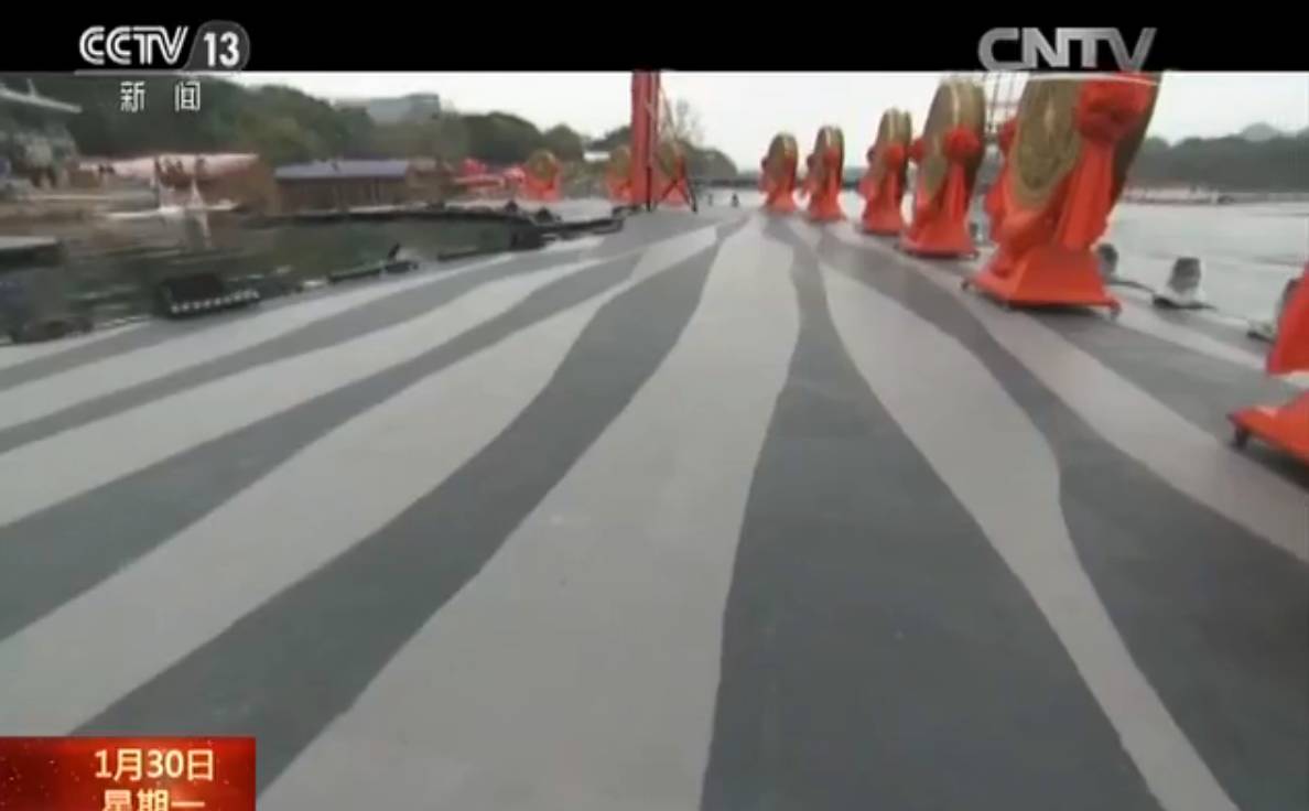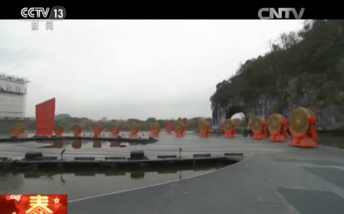 据春晚桂林分会场舞美设计王姗介绍,舞台形状本身就是一种水的涟漪,而且采用黑白相间的环保防滑涂料粉刷,距离水面仅有20厘米左右,夜晚在灯光的照射下,演员们在上面跳舞,就如同在水波上起舞一般美妙。