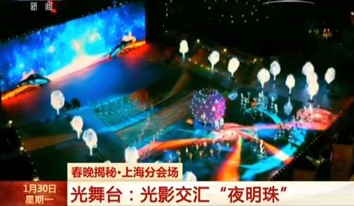 上海分会场设在东方明珠广播电视塔下,是春晚四个分会场中唯一一个位于城市中心的舞台。为了体现国际大都市的繁华,春晚舞台建设者将“光”作为核心要素。现场大概两千平方米的屏幕,7600米的灯带,将近600个电脑灯,在空中配合发光的LED彩球,打造了一个神奇的光舞台。
