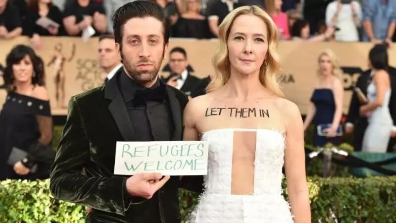 《生活大爆炸》演员西蒙·赫尔伯格举起“欢迎难民”的标语,以抗议特朗普的移民限制令。