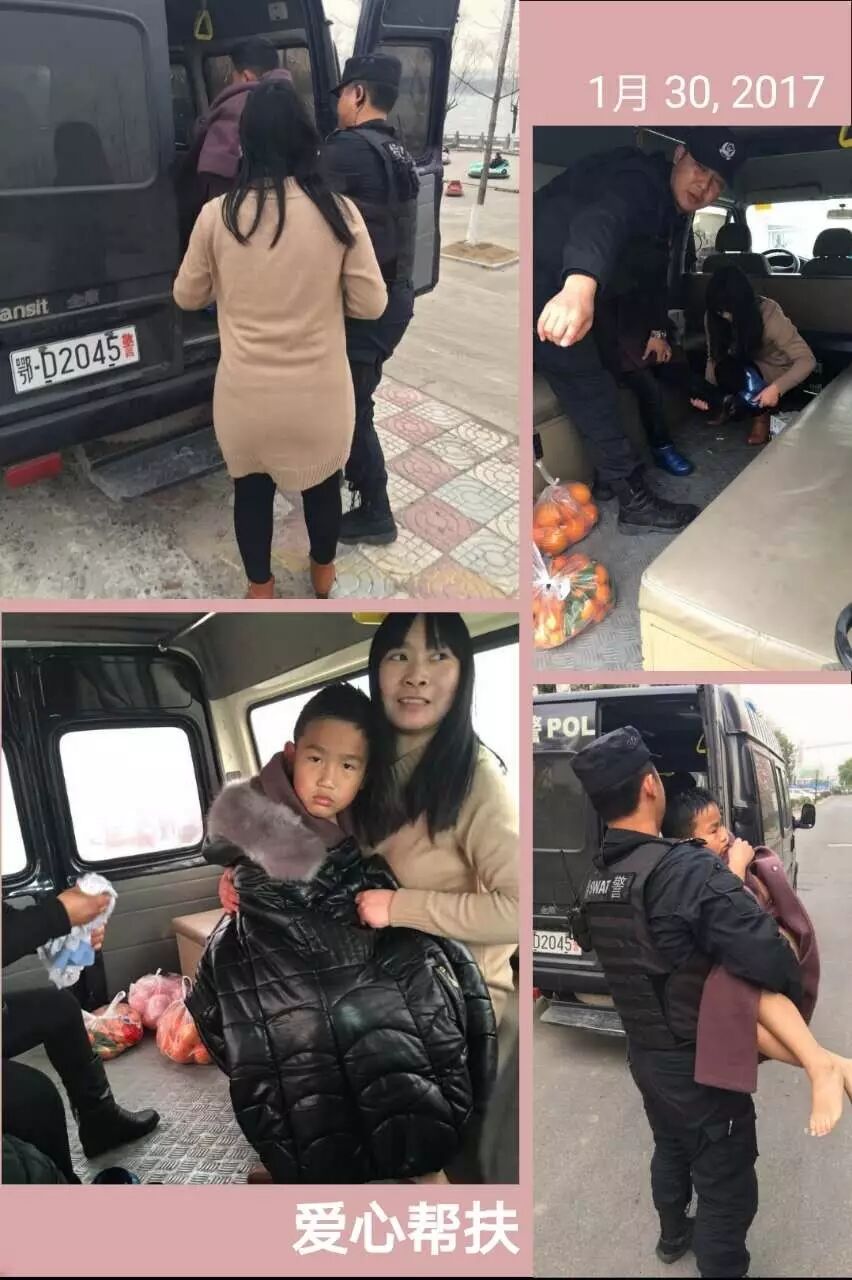 1月30日,一个8岁小孩跌入江中,江陵县公安局巡警大队巡逻组蜀黍抱着获救的小孩,替他裹上毛毯,将其和家人送回家·····