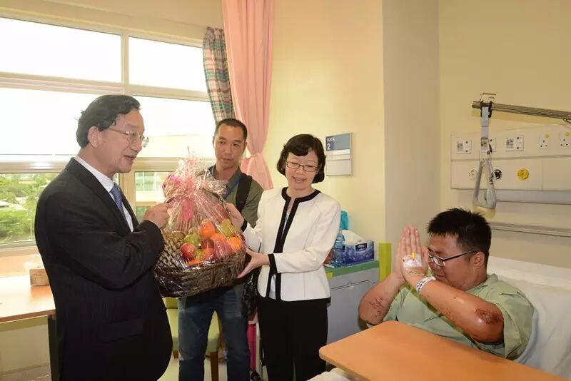 2月1日,中国驻马来西亚大使黄惠康与使领馆工作人员前往沙巴州当地收治获救中国游客的医院看望伤者。