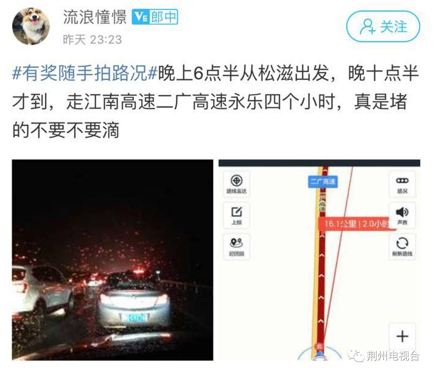 不然就会像无线荆州网友@流浪憧憬一样,堵上好几个小时!