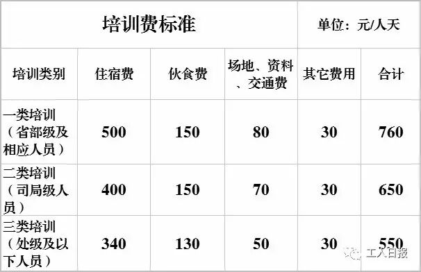 培训类别包括三类,省部级及相应人员、司局级人员、处级及以下人员。其中,省部级及相应人员培训费最高,为760元/人天,司局级干部为650元/天,处级及以下人员为550元/天。本办法自2017年1月1日起施行。