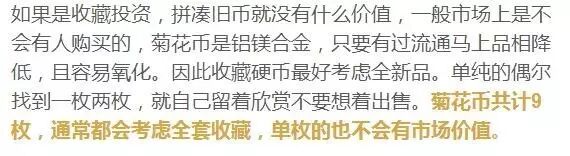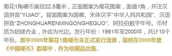 菊花1角硬币最新价格是多少呢?现在1991-1999年1角菊花币一套九枚,九成以上品相约在170元-200左右。但2000年发行的菊花1角只装帧,不流通,单枚价已近千元。菊花一角硬币1991年开始发行流通到2000年结束。