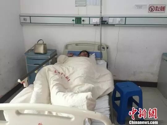 2月12日,广西东兴市人民医院住院部病房内,遭越南边防人员殴打致伤的中国游客谢某躺在病床上。陈燕 摄
