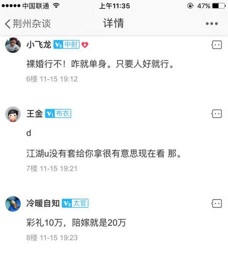 10万元可不是一笔小数目,据了解,这笔“巨款”是黄先生夫妇为儿子存了4、5年的彩礼钱。幸好钱物归原主,否则后果不堪设想啊!不过看到这笔彩礼钱,小荆想问一个问题:你觉得10万块钱彩礼算多吗?在荆州,彩礼一般又是什么标准呢?其实,就在本月,无线荆州一位网友就在“律师在线”版块发帖,询问关于彩礼的问题