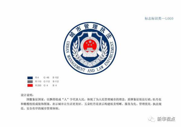 标志标识的设计采用了国徽、人字飘带、盾牌、牡丹花、橄榄枝等元素。国徽象征国家,以飘带组成“人”字代表人民,体现了为人民管理城市的理念,盾牌象征依法行政,牡丹花和橄榄枝组成装饰图案,表示城市让生活更美好,五朵牡丹花表示构建权责明晰、服务为先、管理优化、执法规范、安全有序的城市管理体制。