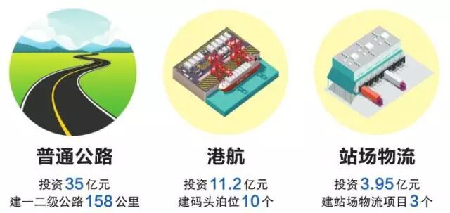 在普通公路、港航、站场物流的建设上,将分别投资35亿元,11.2亿元,3.95亿元,力争建设一二级公路158公里、通村公路800公里,建成码头泊位10个,开工建设站场物流项目3个。