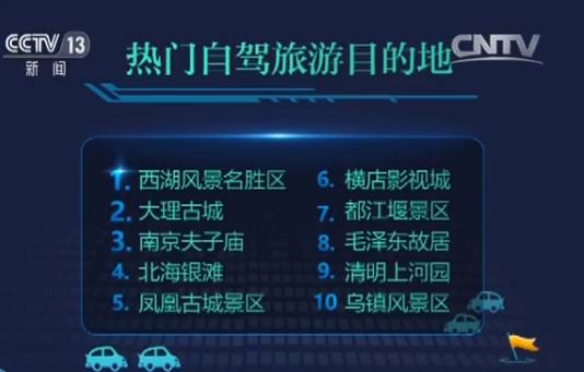 2017年春节出游,杭州西湖风景名胜区又成为最热门的自驾旅游目的地,其后是大理古城、南京夫子庙、北海银滩、湘西州凤凰古城景区、横店影视城、都江堰景区、毛泽东故居、清明上河园和乌镇风景区。