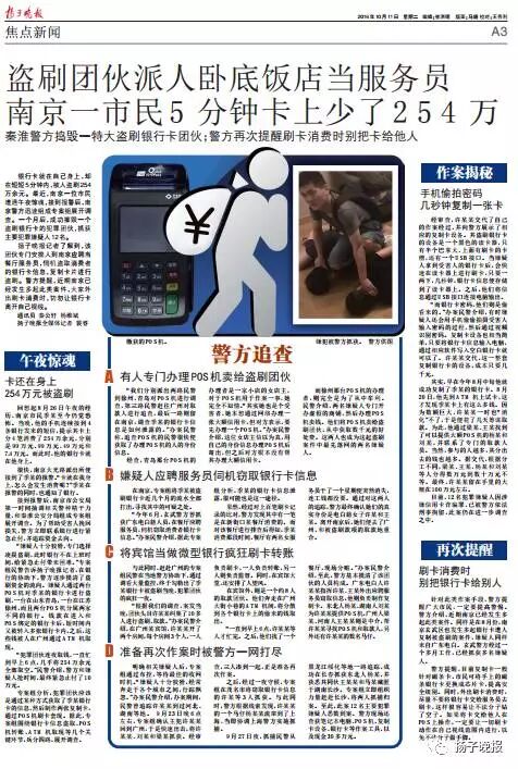 去年10月11日,有媒体发布了这样一条新闻,盗刷团伙派人卧底饭店当服务员,从一位南京市民的银行卡上盗刷了254万。