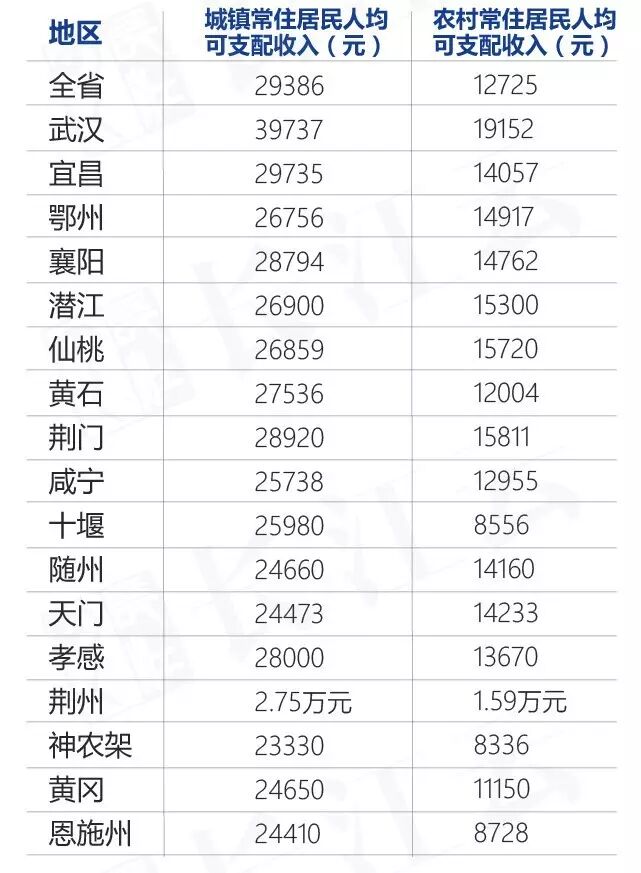 国家统计局湖北调查总队数据显示,2016年湖北城镇居民人均可支配收入是29386元;农村居民人均可支配收入是12725元。湖北城镇居民人均可支配收入比全国平均水平要低,但农村居民收入则稍高一点。