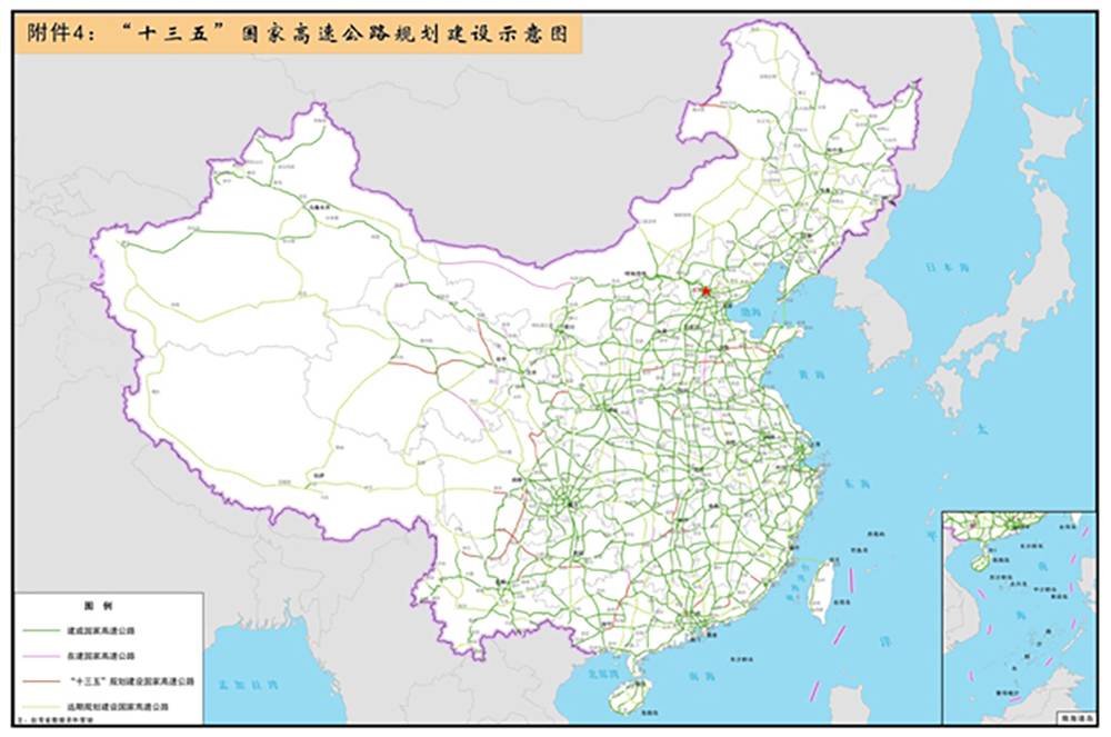 十三五期间,官方重点工程为实施京新高速(G7)、呼北高速(G59)、银百高速(G69)、银昆高速(G85)、汕昆高速(G78)、首都地区环线(G95)等6条区际省际通道贯通工程;推进京哈高速(G1)、京沪高速(G2)、京台高速(G3)、京港澳高速(G4)、沈海高速(G15)、沪蓉高速(G42)、连霍高速(G30)、兰海高速(G75)等8条主通道扩容工程。推进深圳至中山跨江通道建设,新建精河至阿拉山口、二连浩特至赛汗塔拉、靖西至龙邦等连接口岸的高速公路。