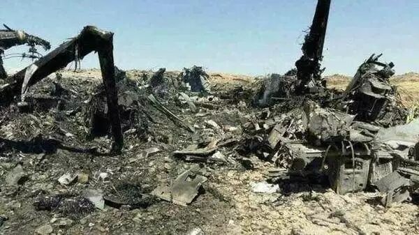 △网上的照片显示的是一架波音V-22“鱼鹰”旋翼机被烧毁的残骸